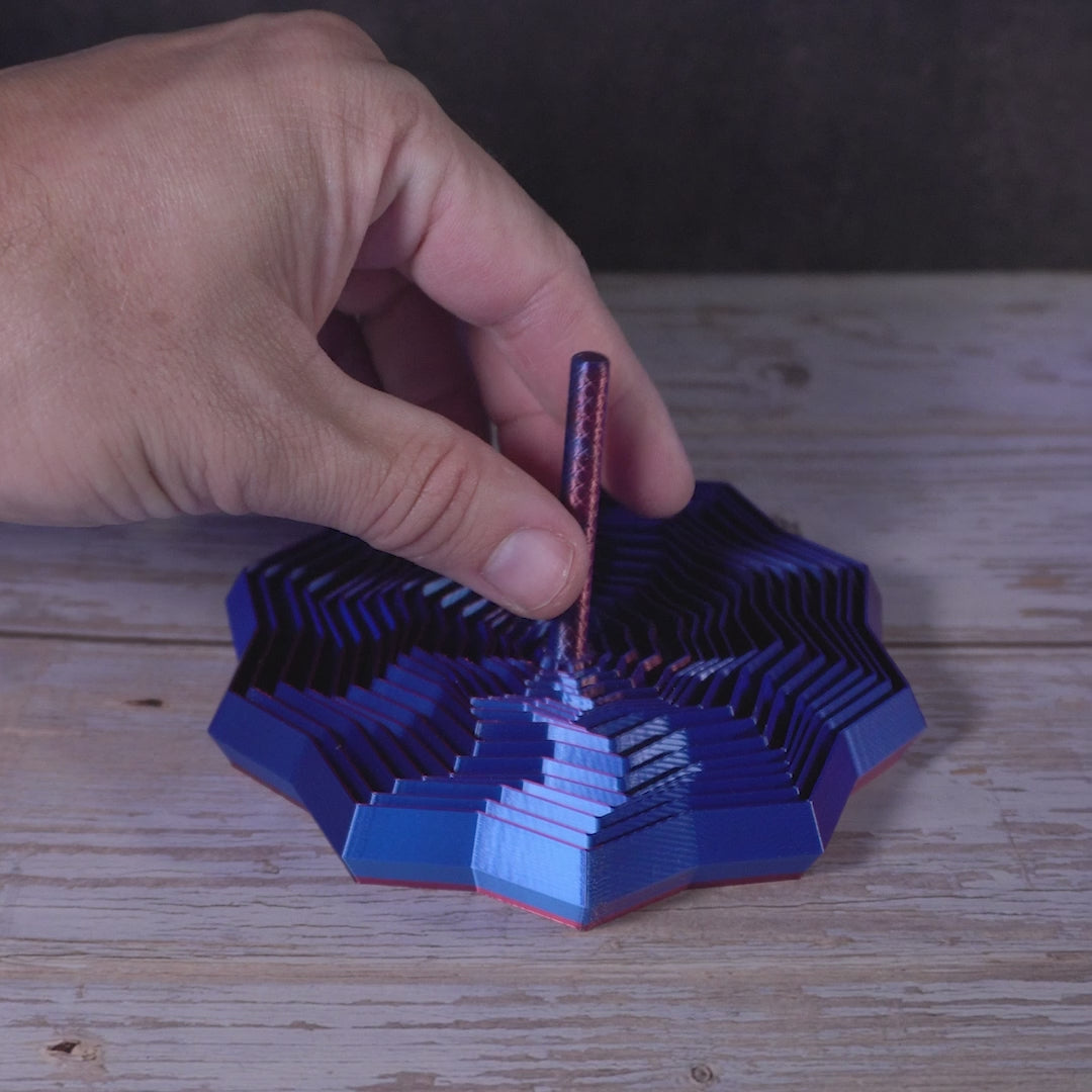 Watch this star-shaped fidget transform before your eyes! Pull the handle to expand and retract the layered design, creating satisfying clicks and mesmerizing motion with every movement. Crafted in eye-catching silk-finish red and blue PLA, it's a feast for both hands and eyes. Twist, turn, and flip it upside down to unlock endless shapes and swirls. Each interaction delivers that addictive sensory satisfaction fidget lovers crave. Perfect for desk play, stress relief, or pure fidgeting fun.